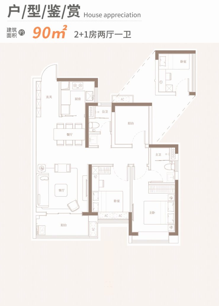 B户型(90㎡ 2+1房):主卧带独立卫浴+全景飘窗,三段式干湿分离,总价162万起;
