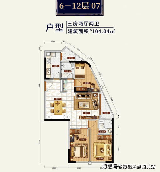 约 71 - 79㎡的两房和约 88 - 104㎡的三房。