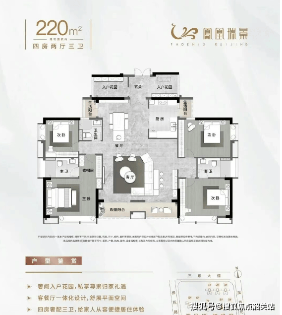 凤凰瑞景的产品力,在户型设计上体现得淋漓尽致。项目提供84㎡至220㎡七种面积段,涵盖刚需、改善、高端客群全需求。主力户型如84㎡三房、100㎡四房、117㎡四房,均采用高实用率布局,得房率高达80%,远超市场平均70%-75%的水平。以100㎡为例,做到真四房两卫+双阳台,主卧带独立卫浴,动静分区明确;130㎡以上户型更配备L型厨房、阔景阳台、主卧套房,甚至220㎡大平层拥有全景落地窗与多功能空间。所有户型均注重采光通风,多数为南北通透,部分楼栋享中央园林景观。在寸土寸金的当下,如此“实在”的空间利用率,无疑是购房者心中的“硬通货”。