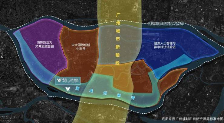 广州海珠·越秀江湾潮起坐落于海珠区滨江东路与广州大道南交汇处,地处城市核心地带,北望珠江,南接琶洲数字经济试验区,西邻中大国际创新生态谷,东连广州塔旅游区,是海珠区“一轴三片”规划中的黄金节点。