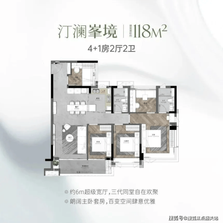 118㎡五房两卫(汀澜峯境)面向改善型家庭,配备270度景观飘窗、独立衣帽间、双主卧套房设计,南向湖景一览无余。LDK一体化格局搭配U型厨房,动线流畅,功能分区明确,满足多孩家庭或三代同堂的居住需求。