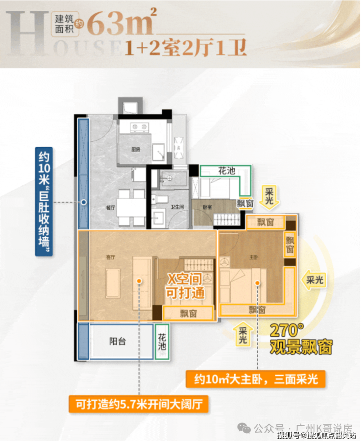 二期的63-82平三房户型,其实用率最高达107%,比市面上普通产品更具空间感。