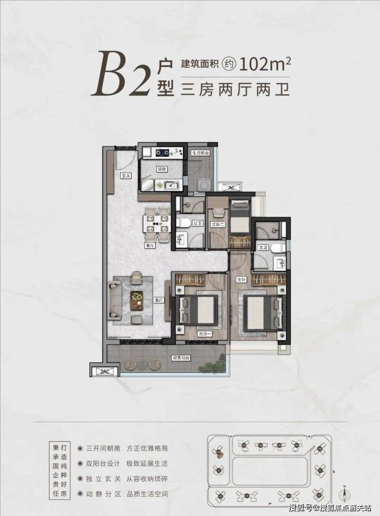 89㎡三房两卫:南向四开间,主卧带270°转角飘窗,得房率85%;