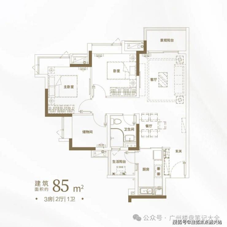 建面约85㎡三房两厅一卫: