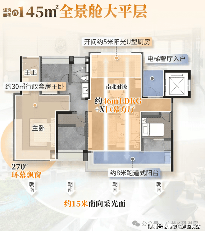 建面约一百四十三平方米全景舱奢宅,打造约四十六平方米 LDKG 大方厅,南北通透的布局让空间采光与通风效果拉满,契合高端改善家庭的生活场景;同样采用中西双厨设计,U 型中厨搭配岛式西厨,洄游式空间设计更适合家庭聚会与好友宴请;主卧为约三十平方米行政主套,配备豪华衣帽间与二百七十度转角飘窗,观景视野无边界,居住体验媲美顶豪产品。还有约一百四十五平方米停机坪大平层户型,打造约六十七平方米 LDKG 一体化超大客厅,实现二百七十度环幕采光,专梯入户设计搭配约十平方米巨无霸电梯厅,进一步提升归家私密性与空间尺度感。