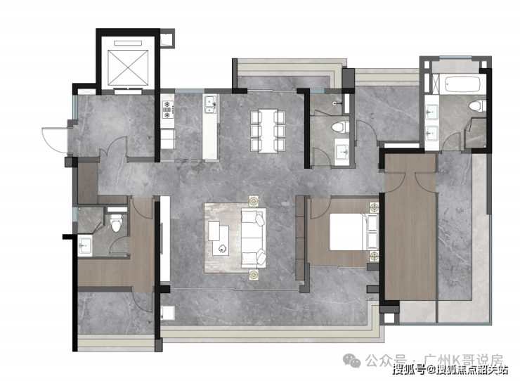 项目户型均为纯改善四房设计,贴合二胎、三胎家庭或三代同堂家庭的居住需求,每一款户型都经过反复打磨优化,空间布局合理,尺度感十足。建面约一百七十平方米航母级大平层,采用 LDKG 极境方厅设计,打造南北通透的世界会客厅,空间开阔大气,成为层峯人士的生活主场;户型配备中西双厨,中式 U 型厨房满足日常烹饪需求,浪漫岛式西厨适配西式餐饮与休闲社交,烹饪场景更加多元;主卧与长辈房均为豪华套房设计,主卧拥有二百七十度飘窗,搭配专属衣帽间与酒店式双台盆卫浴,居住舒适度与尊崇感拉满。