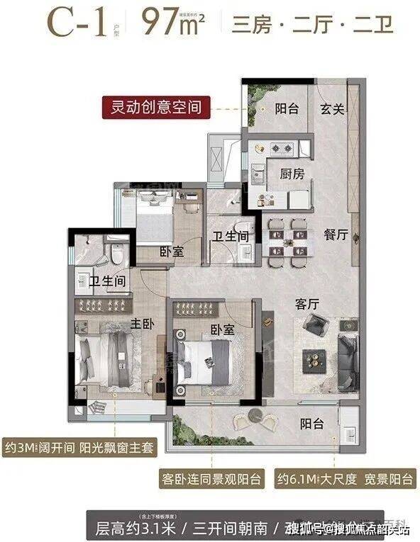 这款户型是区域内的热销产品,特别适合年轻家庭或三代同堂的家庭。其最大的亮点在于极高的实用率,通过巧妙的设计,将97平方米的空间利用到了极致。客厅与餐厅一体化设计,宽敞明亮,适合家庭聚会和日常休闲。三个卧室分布合理,保证了每个家庭成员的私密性。而那个“+1”的功能空间,可以根据需求灵活改造为书房、儿童房或储物间,增加了居住的灵活性。南向的主卧配有大飘窗,采光充足,视野开阔。