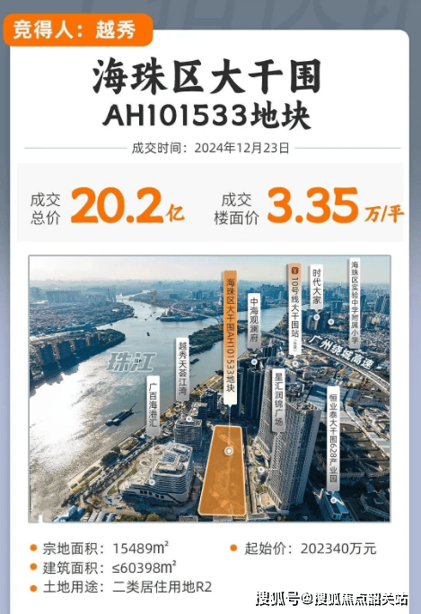 越秀江湾潮起位于广州市海珠区,是越秀地产于2024年12月竞得的大干围AH101533地块上的新项目。项目总建筑面积超过6万平方米,总投资超20亿,折合楼面价33501元/平方米。凭借其独特的地理位置、创新的设计理念以及丰富的配套设施,越秀江湾潮起成为了海珠区滨江板块中备受瞩目的高端住宅项目。