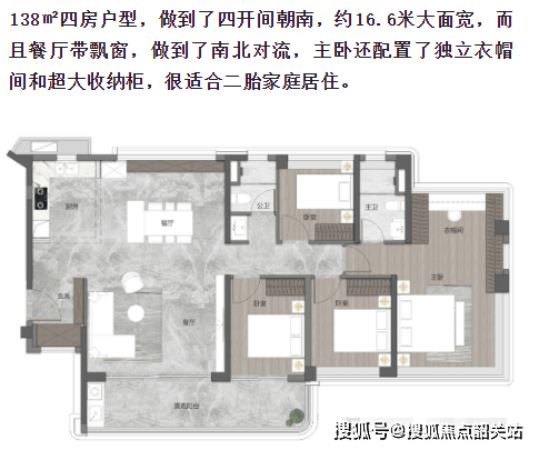 138㎡四房两厅两卫: 四开间朝南,约16.6米大面宽,南北对流,主卧配置独立衣帽间和超大收纳柜。