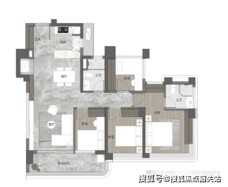 95㎡三房两厅两卫: 南向设计,客餐厅和阳台开间达到5.6米,主卧套房设计,带270°大飘窗。