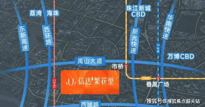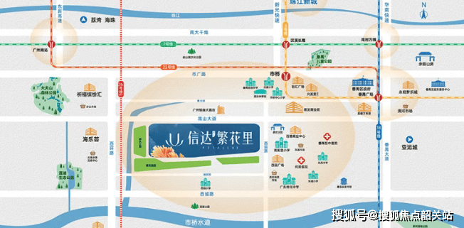 信达·繁花里周围交通网络发达,周边有禺山大道、西环路等主要道路,便于自驾出行。公共交通方面,步行约1.7公里可到达市桥地铁站,也可乘坐电鸡或公交车接驳,便捷前往长隆、番禺广场等地。