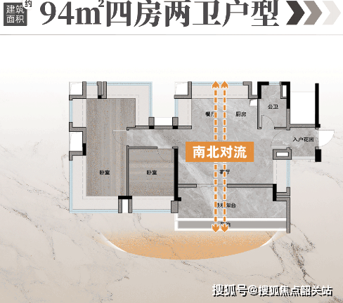 建面约 94㎡舒适四房两卫户型,主打刚需进阶需求,总价 320 万起,适合三口之家、二胎家庭。户型同样为全南向设计,开间宽敞,客餐厅一体化连通,拉伸整体空间感,日常待客、家庭聚餐宽敞舒适。独立四房布局,功能划分清晰,儿童房、老人房、书房各司其职,满足多人口家庭的居住需求,超高公摊优化设计,无多余浪费面积,空间实用性拉满。