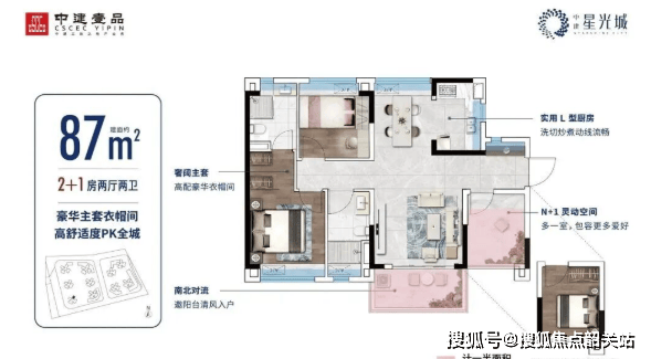 87㎡三房:南北通透,餐客厅一体化,另设多功能房,灵活应对二胎或居家办公需求。