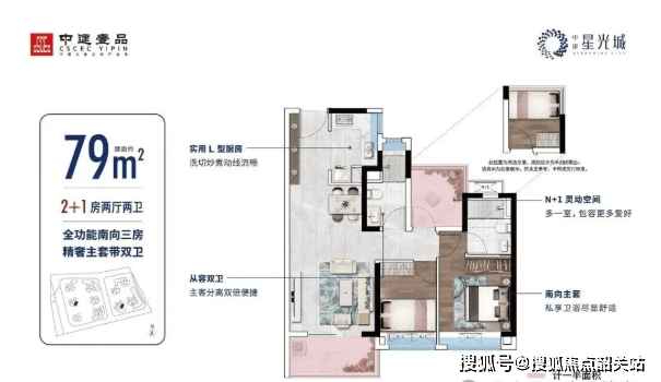 79㎡三房:主卧带独立卫浴,双卫设计提升私密性,东南向瞰园林,适合年轻家庭。