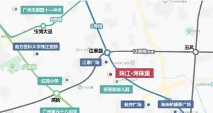 珠江・海珠里占据城央优质地段,交通十分便捷,紧邻燕子岗体育场,坐拥五线地铁环绕的交通网络。最近的地铁站是 2 号线江泰路站,距离约 1.3 公里,步行可达。目前周边已开通 2 号线、8 号线、广佛线,这三条线路已能满足居民日常出行前往城市各个重要区域的需求,无论是去繁华的商业区购物,还是到工作地点上班,都能快速便捷地抵达。而正在建设中的 10 号线、11 号线,更为未来的出行增添了丰富选择,待其开通后,居民将享受到更加多元化、高效的轨道交通服务,进一步提升出行的便利性和时效性。