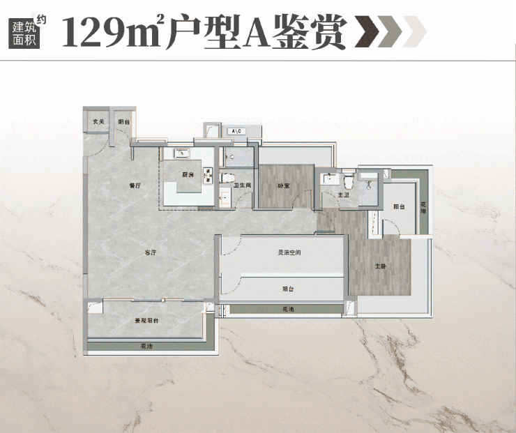 125㎡四房:双主卧设计+7米阳台,可改造成“书房+茶室”多功能空间;