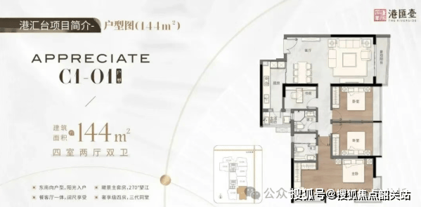 所有户型均注重空间实用性与景观视野,使用率达75%,在高容积率背景下仍力求高效布局。尤其主力户型如117㎡三房、144㎡四房,南北通透,主卧套房设计,搭配全景落地窗,将江景与城市风光引入室内。