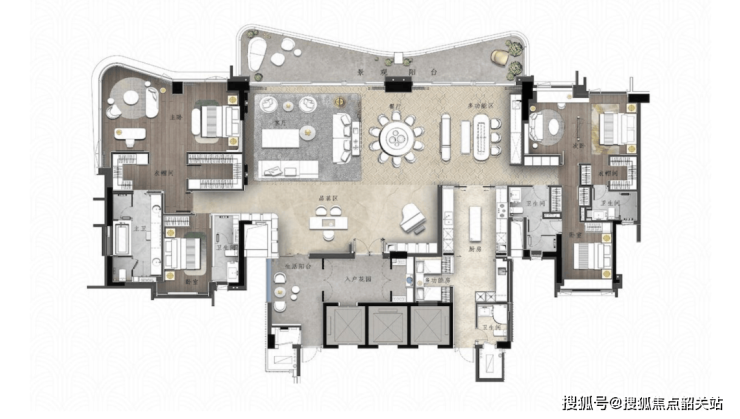 三叠产品【下叠】面积为305㎡产品亮点:私家电梯入户、约3.4米层高、动静分区南北对流、约6.8米挑空餐客厅、中西双厨、三套房设计、部分房间带阳台设计