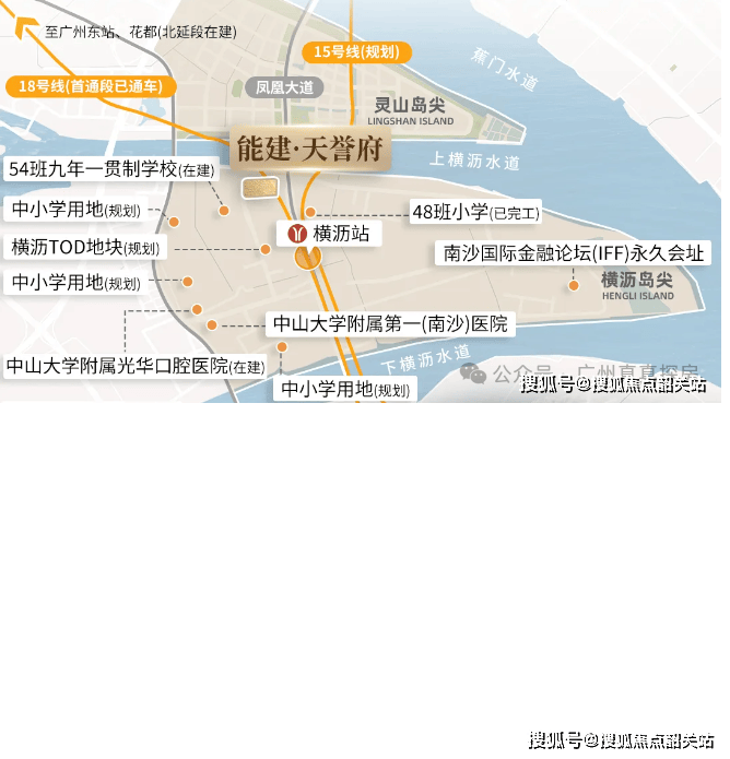 项目直达距离横沥站(15/18/32号线三地铁交汇)约400米,其中18号线已于2021年开通,15号线出现在广州地铁四期的申报目录里面,32号线则是中长期的规划,临近广澳高速、南沙港快速路,可快速到达广州市区、东莞、佛山、中山等城市,交通十分便利。