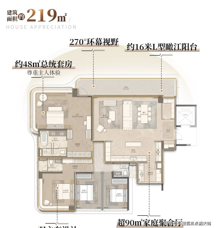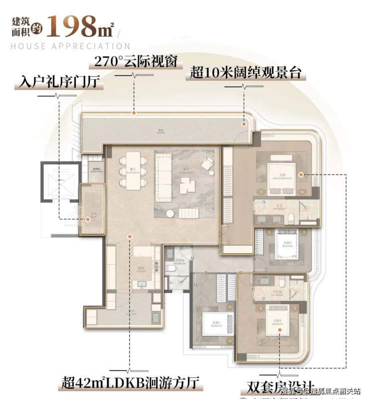 小区配套:超70米高定门庭、酒店式归家双大堂、外立面圆弧语言等,由奢石筑造而来,与迎宾水景相映成趣,滋养出珠水浩瀚之感。以岭南在地文化与星级酒店享受作为底色,铺开滨江公园、度假酒店式社区等,高级烟火与岭南格调相互交织。通过下沉式庭院园林、艺术级泛会所、誉CLUB专属会所、约9000㎡叠水浮岛庭院园林等,考虑到都市人群的自然需求,打造流水、台阶、树影等组成的九境园林,,为业主打造有温度的人居空间。