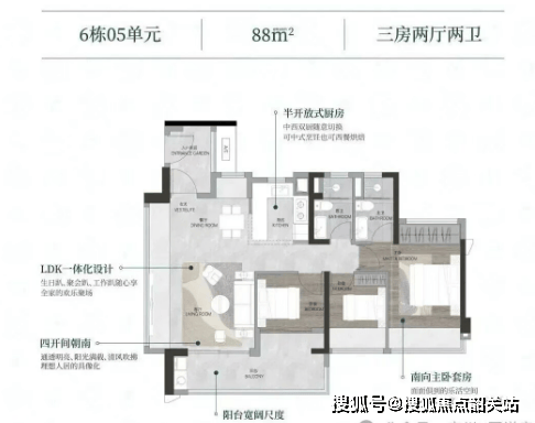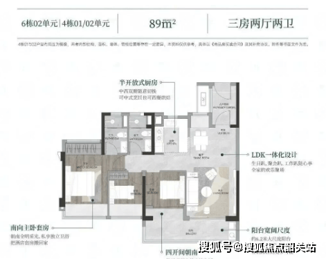 约88㎡三房:阳台开间约6.2米,宽敞明亮,提供舒适的居住体验。