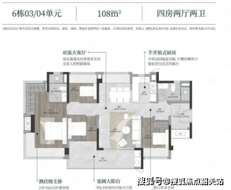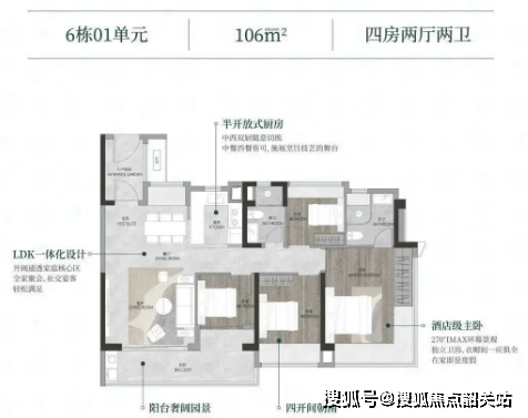 约106㎡四房:阳台开间约6.5米,拥有较大的使用空间,适合大家庭居住。