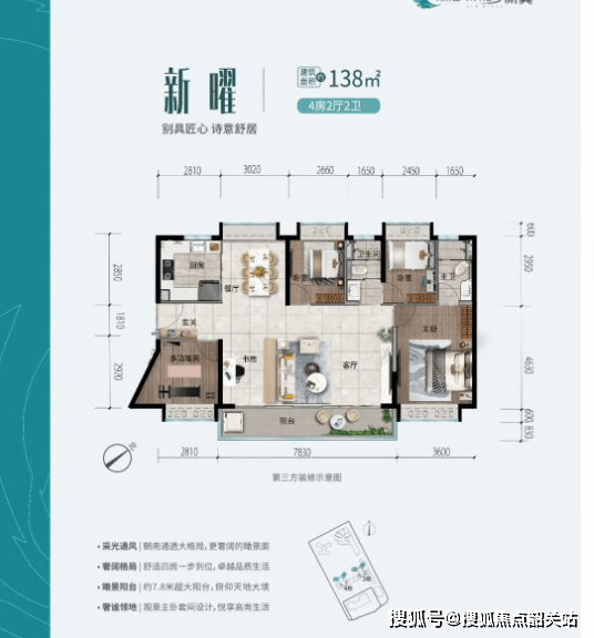 建筑面积约138㎡大四房户型:同样采用全南向设计,横厅布局提高了空间利用率。7.8米宽的超大阳台保证了充足的采光,让餐客厅充满阳光,非常适合会客聚餐等社交活动。