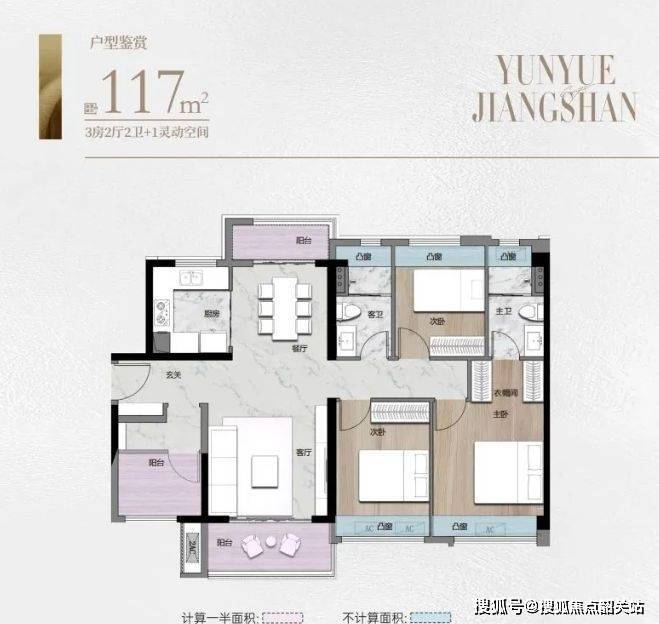 117㎡南北对流双阳台四房:该户型的亮点在于南北对流和双阳台设计。片区内少见的南北对流布局,使空气在室内形成自然流通,清风入室,保持室内空气清新。双阳台设计,一个用于晾晒衣物,另一个可打造为休闲空间,摆放桌椅,享受户外时光。一线朝南的设计,让客厅和卧室都能充分享受阳光。约 6.9 米横厅设计,增加空间开阔感,适合家庭聚会和休闲娱乐。四房设计满足家庭多样化居住需求,各房间尺度适宜,可根据家庭实际情况灵活布置。主卧空间宽敞,配备独立卫生间,提升居住品质。整体户型设计注重通风采光与空间利用,为家庭提供舒适、健康的居住环境。