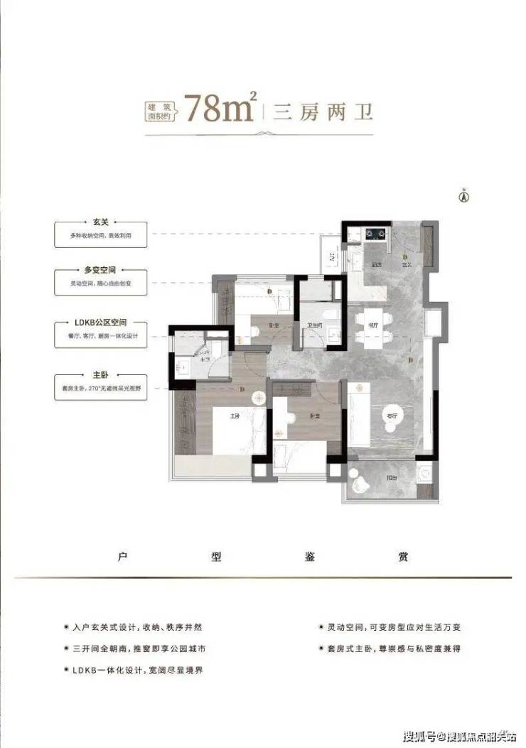 78㎡三房:总价250万起,LDKB一体化设计,套房式主卧,南向面宽达10米。