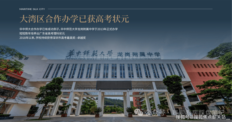 项目已正式签约引入华中师范大学黄埔实验学校,打造12年制一贯制公办教育体系,由华中师范大学教育集团直属运营管理。华中师大第一附中连续六年全国百强高中排名第一,2023年一本上线率99.12%,是国内顶尖的基础教育品牌,大湾区办学已有培养出高考状元的成功案例,办学实力稳居广州东部第一梯队。