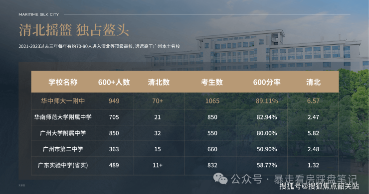 优质的教育资源是人居价值的核心基石,中建海丝城以“全国榜一”的顶尖名校资源,构建了12年一站式全龄菁英教育体系,教育配套扎实落地,确定性拉满,彻底解决了家庭的核心教育焦虑。项目已正式签约落地华中师范大学黄埔实验学校,打造十二年一贯制公办教育体系,规划设置24个小学教学班,以及54个中学教学班(含初中24班、高中30班),由国内顶尖教育集团——华中师范大学教育集团直属运营管理,实现了从小学到高中的全周期优质教育覆盖,真正做到家门口的12年无忧教育。作为学校办学主体的华中师范大学第一附属中学,在“全国百强高中排行榜”上连续六年稳居全国第一,断层式领跑全国基础教育领域,被誉为“清北摇篮”。根据华中附校官方发布数据,2023年华中师大第一附中600分以上人数达949人,一本上线率高达99.12%,近乎实现全员本科上线;2021-2023年三年间,每年均有约70-80名学子考入清华、北大等国内顶级高校,顶尖人才培养能力遥遥领先于广州本土名校。华中师大教育集团在大湾区的合作办学已有成功典范,华中师范大学龙岗附属中学于2013年正式办学,短短数年便培养出广东省高考理科状元,2018年以来持续获得深圳市高考最高奖——卓越奖,办学实力与成果有目共睹。此次华中师大教育集团直属运营管理华中师范大学黄埔实验学校,将全面共享本部的教育理念、师资团队、课程体系与教研资源,打造广州东部基础教育的标杆名校。项目与学校无缝衔接,孩子上学无需远距离奔波,家长无需早晚接送,真正实现“目送式上学”,既保障了孩子上学的安全与便捷,也为家庭节省了大量的时间成本。浓厚的书香氛围、顶尖的教育资源、确定的升学保障,不仅为孩子的成长提供了全周期的优质教育护航,更形成了纯粹的高知居住圈层,让孩子在耳濡目染中成长,为家族的文脉传承与长远发展奠定坚实基础。