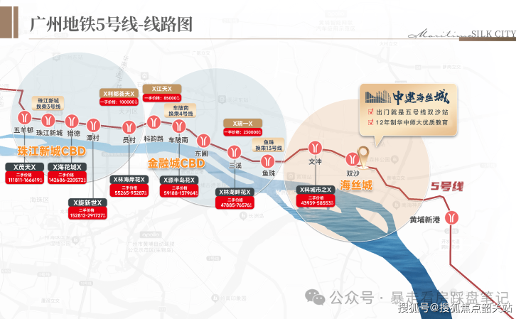 中建海丝城坐拥“双轨交汇+四横四纵”的全维立体交通路网,是广州东罕见的真正地铁上盖物业,无缝衔接广州全城核心板块,实现了“出门即地铁、一线通全城”的极致通勤体验,彻底解决了城市置业者的通勤痛点。轨道交通方面,项目当前在售的阅山组团,出门直达地铁5号线双沙站B口,直线距离仅约50米,通过地下连廊可实现社区与地铁站的无缝衔接,无需日晒雨淋,真正做到“下楼即地铁”的从容通勤。地铁5号线作为广州城市黄金动脉,纵贯广州三大发展主轴,一线直达金融城、珠江新城、越秀、荔湾等广州核心城区,无需换乘即可通达广州全城各大核心商圈与商务区,一线换乘可到达广州所有CBD板块。同时项目地处地铁5号线与13号线双轨交汇核心区,可快速接驳地铁13号线,进一步串联广州东部产业带与中心城区,形成覆盖全城的轨道交通网络。地面路网方面,项目周边形成了四横四纵的完善路网体系,北接广园快速、南连黄埔东路、西临广州大道东、东靠开创大道,可快速接驳广深沿江高速、华南快速、环城高速、京港澳高速等高速路网,10分钟可达黄埔核心区,30分钟畅达珠江新城、琶洲CBD、金融城,40分钟通达粤港澳大湾区佛山、东莞等核心城市,无论是日常通勤、商务出行还是周末休闲出游,都能实现高效畅达。完善的立体交通体系,不仅为业主带来了极致的通勤便捷性,更让项目深度融入广州主城半小时生活圈,成为广州东进主轴上的交通枢纽型人居标杆,为项目赋予了强劲的资产价值与发展潜力。