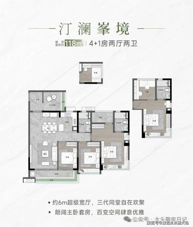 3. 建面约118㎡4+1房2厅2卫:改善型优选户型,四开间朝阳设计,奢享11面采光,全明通透,采光与通风效果极佳。打造约6米超宽客厅,空间宽敞开阔,可容纳三代同堂欢聚,满足多人口家庭的居住需求。配备约6.2米双面宽阳台,景观视野开阔,可俯瞰社区园林与湖山盛景。采用270度飘窗设计,主套全明开阔,奢阔主卧套房空间功能可灵活百变,既能作为卧室使用,也可增设书房、衣帽间等功能区域,超高使用率让空间更具延展性,适配改善型家庭长期居住。