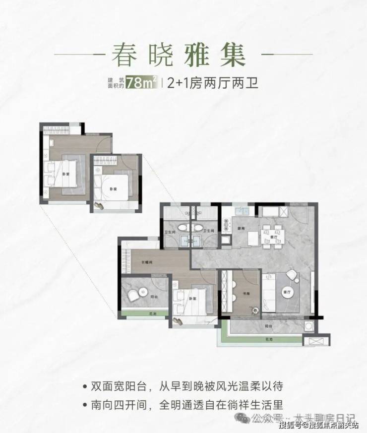 1. 建面约78㎡2+1房2厅2卫:刚需上车首选户型,四开间采光设计,全明通透,确保室内每一个空间都能获得充足阳光。采用LDKG一体化客餐厨灵动设计,客厅与次卧空间可随心组合,灵活适配不同居住需求。配备约5.5米双面宽阳台,景观视野开阔,可同时兼顾观景与晾晒功能。虽为小户型,但配备豪宅级独立主套,主卧开间达3.8米,空间宽敞舒适,满足刚需家庭对居住品质的追求,超高使用率让空间利用率最大化,轻松实现三口之家的舒适居住。