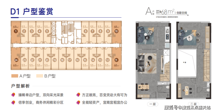 四、户型:35-68㎡复式公寓+330㎡独栋商墅,买一层送一层+全南向海景+百变空间,投资自住双优