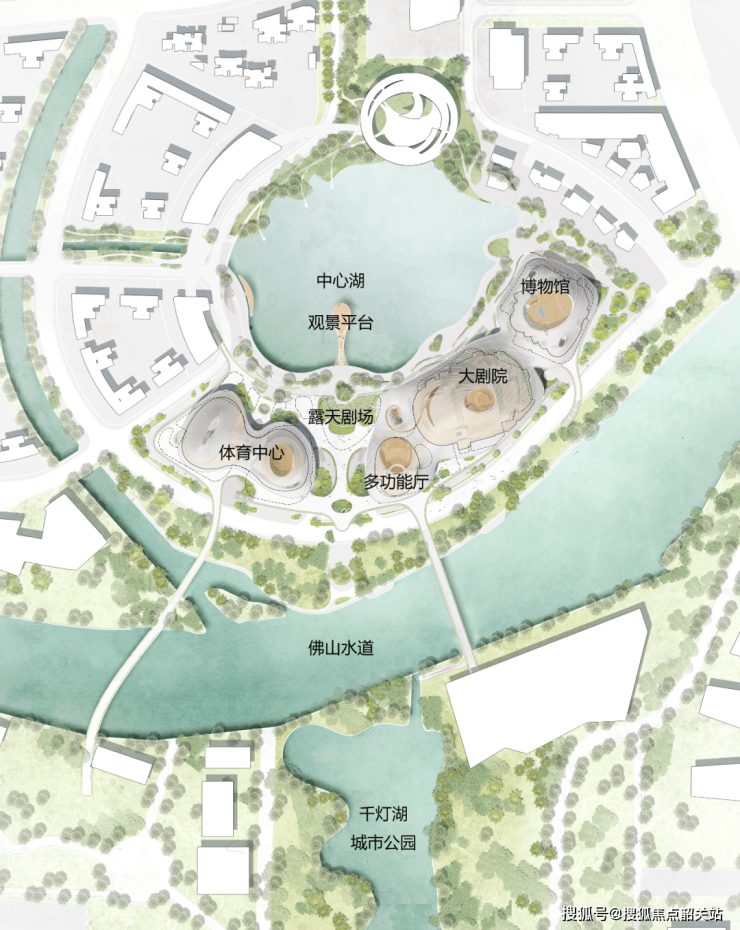 南海艺术中心项目通过 7 米高的二层景观大平台,实现了三大场馆之间的有机连通,同时向外延伸串联起场地北侧的中心湖、滨江公园与南侧的城市空间,将为周边区域带来完善的文化、体育、休闲配套。