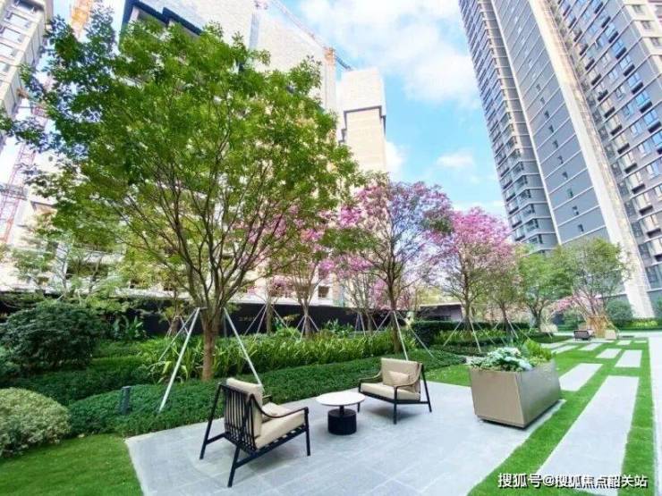 在社区内部配套方面,华润置地顺德悦府二期展现出了极高的用心程度。园林景观是项目的一大亮点,采用岭南森居风格,以“一环双轴三园八院”的空间格局,借鉴清晖园的造园理念,打造出可进入、可停留、可使用的院落式空间。这种空间不同于传统的观赏性花园,既有明确的边界感保障私密性,又能让业主充分亲近自然。入园处的“读云水院”极具特色,采用幻影蓝高定奢石和透光大理石材打造的下沉式水镜庭院,在绿荫掩映下,将蓝天白云倒映其中,随手一拍都是美景。每栋楼下方,尤其是小高层周边,都设有不同主题的私享院落,闲暇时在此小憩品茶,惬意十足。园林植被搭配也十分讲究,大量种植凤凰木、朴树等主树,辅以红果冬青、乌桕和造型柚子木,再加上丰富的地被植物,形成高低错落的层次感,步道旁的紫色风铃木花箱更添一抹亮色。此外,每栋楼的架空层都有独立主题,涵盖会客、书吧、健身等功能,搭配岭南特色的镂空花窗,实现了私密性与自然景观的完美融合。