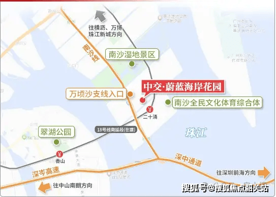 中交蔚蓝海岸位于万顷沙板块核心区,直线距深中通道出口约3公里,距地铁18号线南延段“万顷沙站”(规划)约800米。从项目出发: