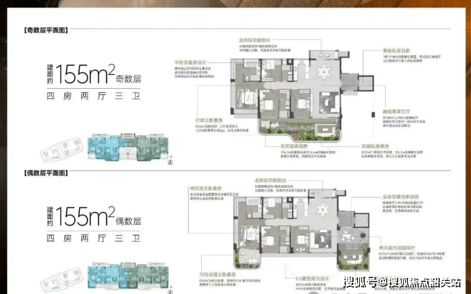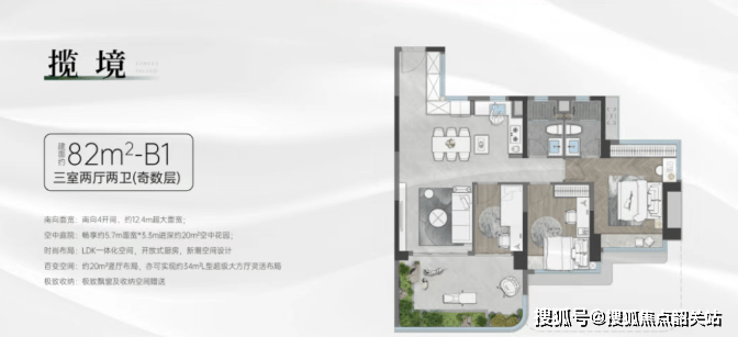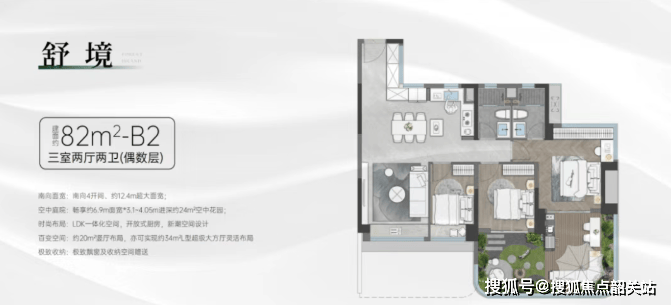 82㎡:奇数层户型,3房2卫,竖厅格局,客厅与次卧可打通形成超级大方厅。四开间朝南,南向面宽达到12.4米,空中花园面积达20㎡;偶数层户型的空中花园面积更大,有24㎡。