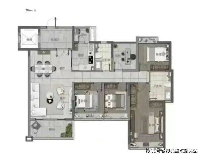 **143㎡“4+1房”**为明星产品:配备私家电梯厅,增强归家仪式感;客饭厅直厅连通观景阳台,形成通透公共区域;四个卧室均带飘窗,主卧设步入式衣帽间与独立卫浴;额外“+1房”可灵活改造为书房、儿童活动室或客房,适应不同人生阶段的家庭结构变化。