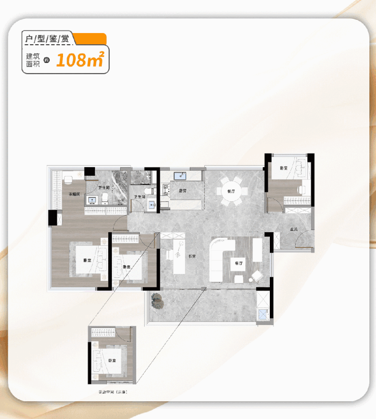 108㎡四房两厅两卫:约15米南向超大面宽,餐客厅一体化设计连通7.2米阔景阳台,主卧带步入式衣帽间,私密性佳。