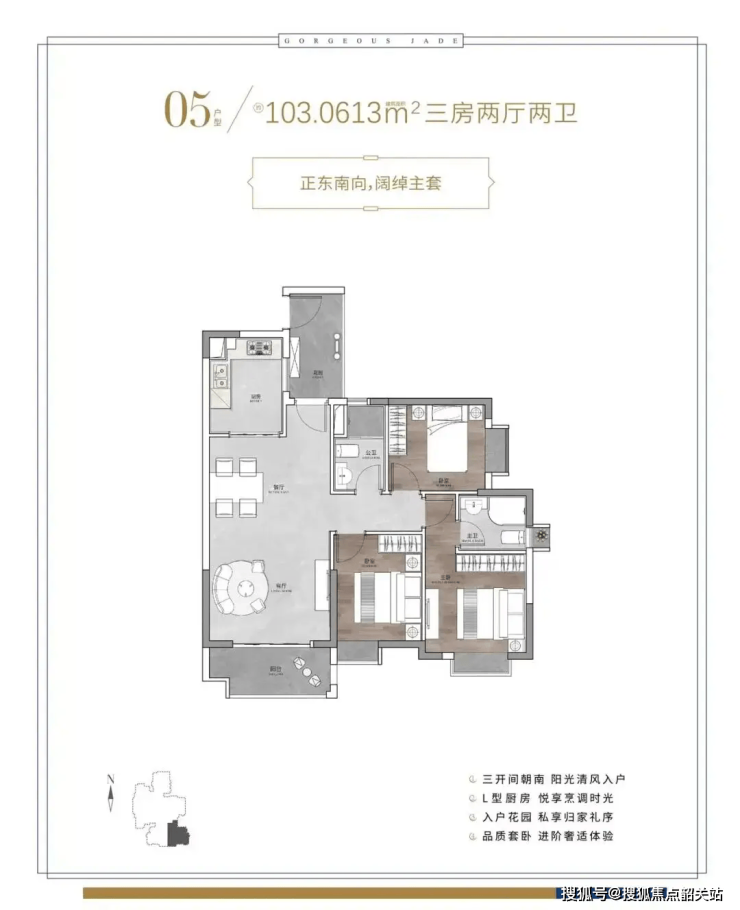 89–103㎡三居室:主力改善户型,三房两卫设计,主卧带独立卫生间,私密性强。部分户型做到南北通透,双阳台配置(生活阳台+景观阳台),通风采光俱佳。103㎡户型甚至实现“三开间朝南”,在区域内实属难得,适合多代同住或对居住品质有更高要求的家庭。