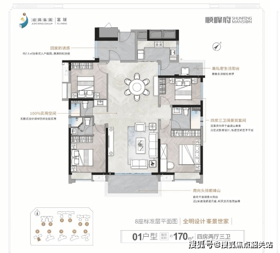 顺峰府当前主力在售产品包括8栋建面约170–180㎡的精装大平层,采用两梯三户设计,主打四房三卫双套间布局,配备约8.1米超长大阳台,实现南北对流双阳台与南向头排瞰山视野。此外,项目即将推出12栋仅58套的300㎡毛坯大平层,层高31层,采用两梯两户“专梯专户”设计,极大提升归家私密性与效率。该产品不仅在空间尺度上突破常规,更通过电梯厅入户礼仪空间延伸生活场域,重新定义顶级改善人居标准。