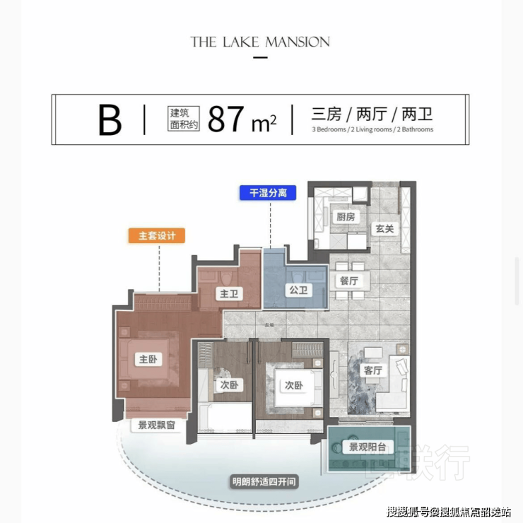 建面84㎡三房两卫:南北通透,主卧带270°转角飘窗,总价270万起。