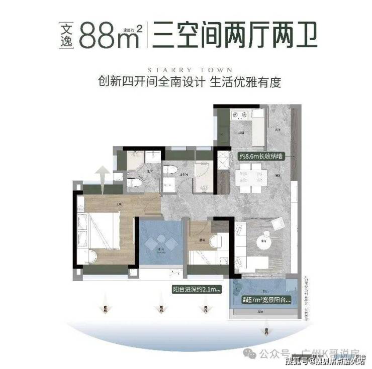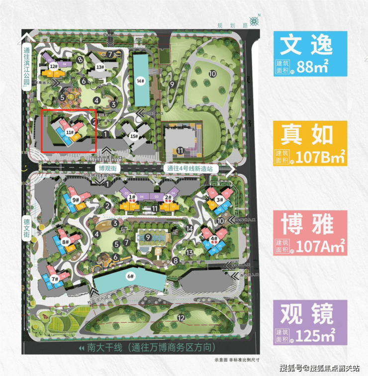 在售建面约88-125㎡三至五空间,户户朝南,皆为270°宽景大阳台,4-4.5面宽朝南,高使用率产品。