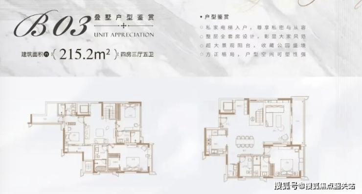 项目为6层的叠拼别墅,分上、中、下三叠。每户均拥有独立私家电梯直入门厅。下叠户型通常附带地面私家花园;中叠拥有宽敞的阳台或露台;上叠则拥有屋顶星空露台或挑空空间。由于叠墅产品在挑空、露台、阳台、地下室(部分) 等方面的拓展优势,其实际可使用面积通常远超产权面积,空间利用率极高。