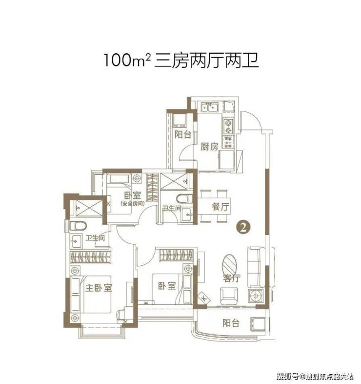 该户型空间布局合理,南北通透,采光通风效果好。客厅连接景观阳台,视野开阔,既能享受充足的阳光,又能在闲暇时俯瞰小区美景。餐厅与厨房相连,方便备餐和用餐。三个卧室分布合理,动静分区,保证了居住的私密性和安静。主卧为套房设计,带有独立卫生间,方便又舒适。