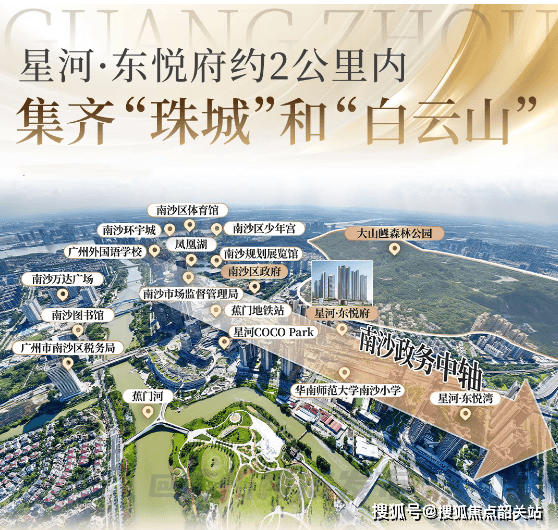 生活配套完善,位于南沙区府核心,半数以上高端市政和配套资源汇聚于此。约 10 万㎡情景式购物中心星河 COCO Park 已开业,4 层主题购物空间搭配 1 层天台花园,引进精品超市百佳永辉、超 5000㎡横店影城,南沙首进品牌超 60%,集潮流、美食、运动、休闲、娱乐于一体。高规格商业 17Town(拾柒糖)也即将入驻。距项目约 200 米的广州市妇女儿童医疗中心南沙院区儿科学专业排名跻身全国第 4 位,周边还有广州市南沙中心医院、中山一附属南沙医院等优质医疗资源。同时,946 万㎡大山乸森林公园犹如城市绿肺,东眺蕉门河滨水公园,自然景观优越,为居民提供舒适宜居的生活环境。