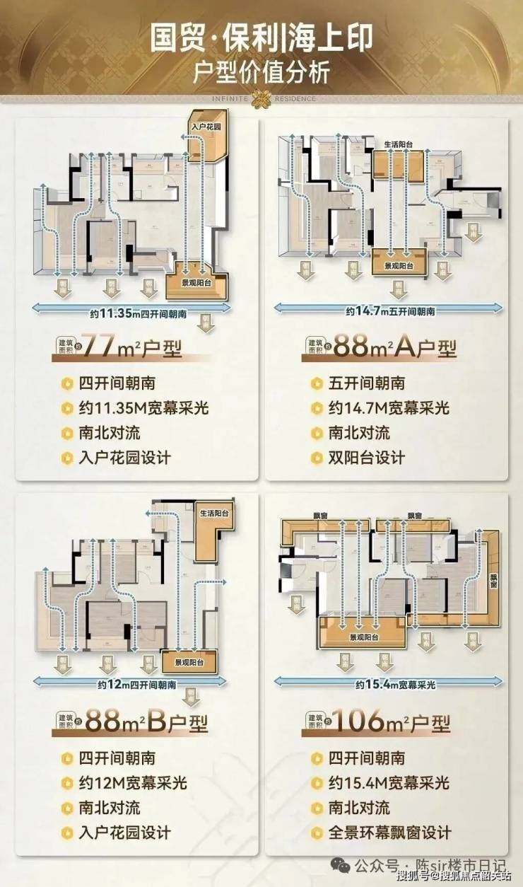 国贸·保利|海上印在产品力的打造上,可谓下足了功夫。项目总共只有两栋住宅楼,均为26层、两梯五户的高层设计,总货量约为240套。这种小体量的规划,不仅保证了社区的私密性和尊贵感,也使得每一户都能享受到更为宽敞的公共空间和更少的邻里干扰。项目主力户型涵盖了77㎡三房、88㎡四房以及106㎡四房,全部采用全南向或接近全南向的布局,且使用率普遍超过100%,这在当前的房地产市场环境下显得尤为珍贵。