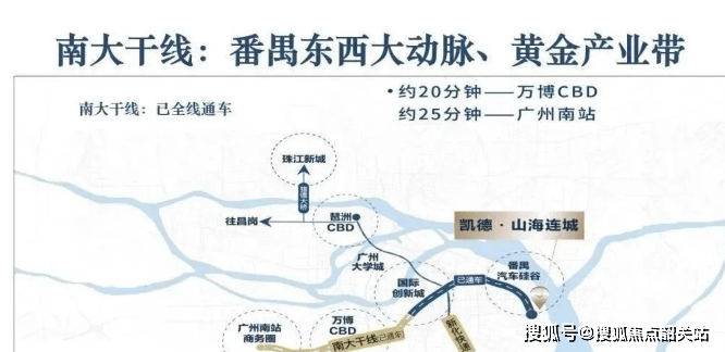 凯德山海连城的交通配套呈现 “自驾便捷 + 公共交通待完善” 的特点,虽当前地铁网络尚未直接覆盖,但规划线路与现有路网已为未来湾区穿梭奠定基础。自驾方面,项目紧邻已全线开通的南大干线,这条主干道串联番禺南北,30 分钟内可直达琶洲(26 分钟)、万博 CBD、广州南站与大学城,通过华南快速、新光快速等快速路,1 小时内可抵达珠江新城、海珠等广州主城区,自驾通勤效率极高,尤其适合在琶洲、万博工作的业主。